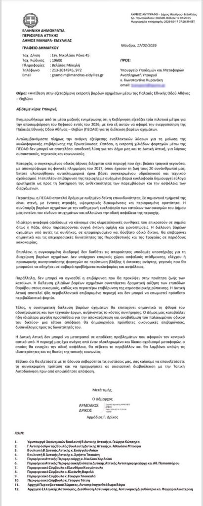 ⛔ Λέμε όχι στην προτεινόμενη εκτροπή βαρέων οχημάτων μέσω της Παλαιάς Εθνικής Οδού Αθήνας – Θηβών. Η περιοχή μας δεν μπορεί και δεν πρέπει να μετατραπεί σε διάδρομο βαρέων φορτηγών.