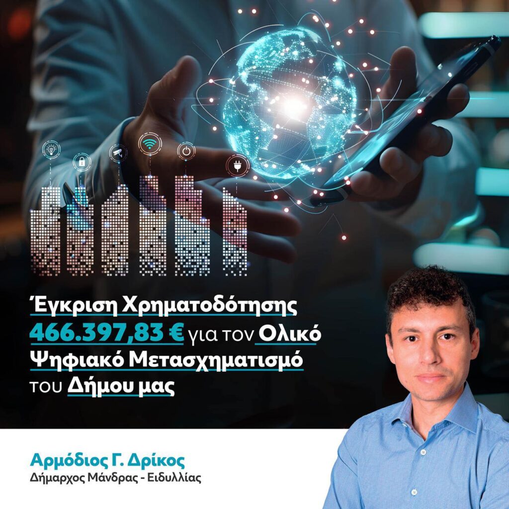 Στον Δήμο Μάνδρας–Ειδυλλίας κάνουμε ένα μεγάλο άλμα προς το μέλλον. Με εξασφάλιση χρηματοδότησης 466.397,83€, υλοποιούμε ένα ολοκληρωμένο πρόγραμμα ψηφιακού μετασχηματισμού που φέρνει σύγχρονα εργαλεία, περισσότερη ασφάλεια και καλύτερες υπηρεσίες για όλους.